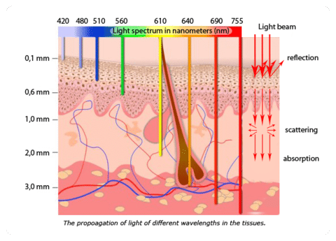 - Onzichtbaar NIR licht optimaliseert de werking van de celmembranen, verbetert de celcommunicatie, versnelt het genezingsproces van de huid met 80 %, stimuleert elastine, vermindert pigment, voorkomt littekens enz.
